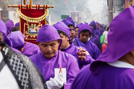Antigua, Guatemala: March 18 2018: Purple robed men cueing at the procession of San Bartolome de Becerra in 1a Avenida