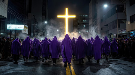 A hauntingly beautiful night scene captures a large crowd draped in purple cloaks, walking solemnly beneath a brightly illuminated cross. Fog envelops the street, enhancing the atmosphere of reverence and mystery, while the urban landscape adds a contrast between tradition and modernity.