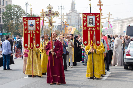 KIEV, UKRAINE - JULY 27, 2016 : Parishioners Ukrainian Orthodox Church Moscow Patriarchate during religious procession. At present there is undeclared war of Kiev Patriarchate and Moscow Patriarchate