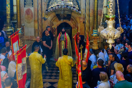 Jerusalem, Israel - May 01, 2021: The party of the Coptic Patriarch of Jerusalem, on Holy Saturday (Easter), in the Holy Sepulchre church, Jerusalem, Israel