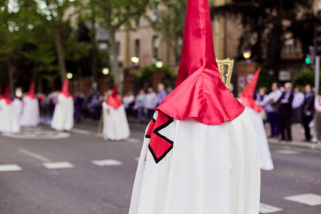 Madrid, Spain - April 13, 2017: traditional popular tradition in Easter week Spanish procession. Nazareno penitents catholic parade
