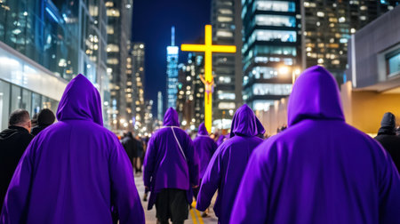 Shadowy figures in purple hoods march under city lights, crucifix glowing during nighttime Holy Week event