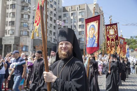 Kiev, Ukraine - July 27, 2019: Orthodox monks in black go at the head of the procession on the day of the baptism of Rus.