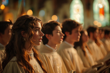 Church choir concert in cathedral, choral artists singing, group of European boys and girls singing in a chorus, students and choristers in white and green uniform performing on stage with conductor