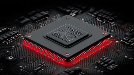 Explore a stunning image of a high-tech microchip set against a dark circuit board. The glowing red highlights emphasize its intricate details and advanced technology.