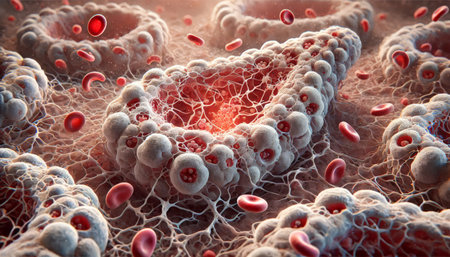 A captivating close-up view of red blood cells and immune cells interacting within a microscopic environment, showcasing biological processes in action.