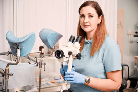 Portrait woman gynecologist working in gynecological cabinet with modern equipment. Doctor in blue shirt using colposcope in clinic. Concept if gynecology, healthcare and medical workers.