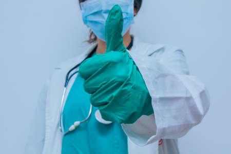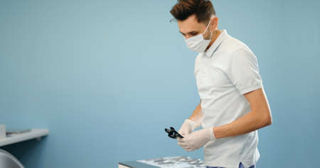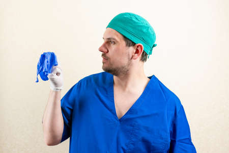 Doctor in blue uniform and medical mask. Fools around with gloves. High quality photo