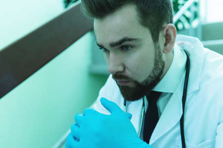 Doctor ponders a diagnosis of bowel disease on a blurred background.