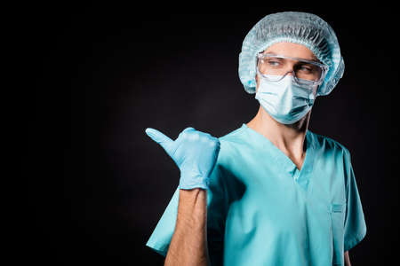 Closeup photo of nurse guy expert doc virologist covid19 protection control direct thumb finger empty space wear mask uniform suit facial goggles surgical cap isolated black color background