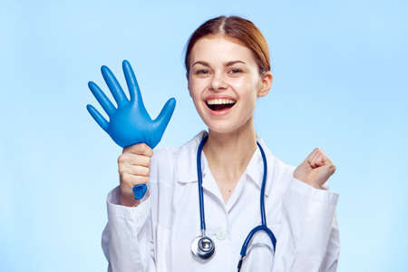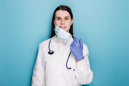 Professional female doctor in latex protective gloves removing face mask, wears white uniform and stethoscope, isolated on blue background. Covid 19, healthcare workers and preventing virus concept