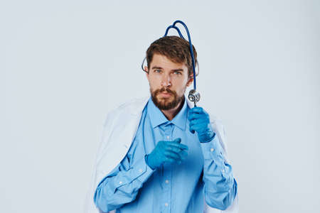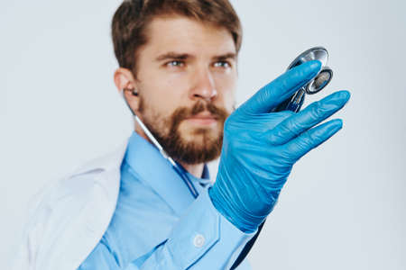 Man with a beard on a light background in medical clothes, a stethoscope.