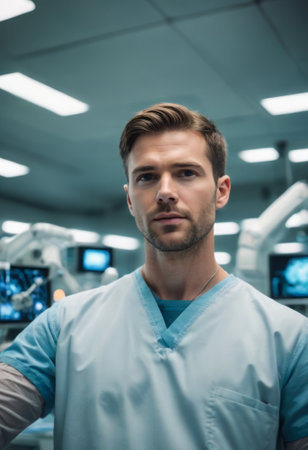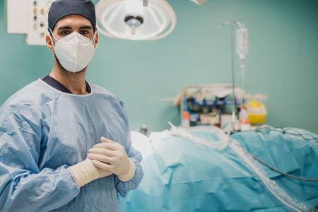 A male surgeon standing confidently in an operating room, wearing scrubs and preparing for surgery.