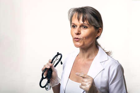 Young beautiful woman in medical gown holds a stethoscope on a gray background