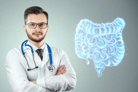 Doctor and holographic bowel scan projection with vital signs and medical records. Concept of new technologies, body scan, digital x-ray, abdominal organs, modern medicine