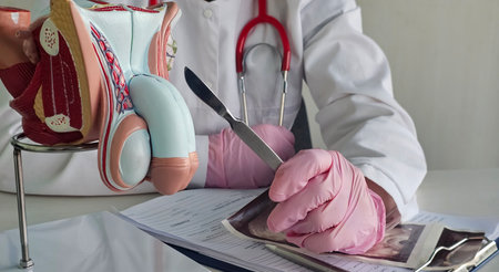 The doctor in the hospital examines the pictures of the prostate, X-ray of the prostate gland on a white background, close-up.