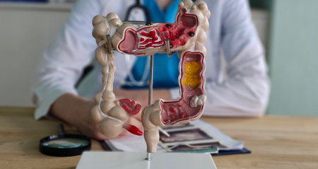 Doctor showing model of large intestine at white table, closeup