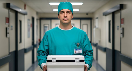 A man dressed in teal scrubs and a matching surgical cap stands in a hospital hallway. He holds a white case in front of him with both hands, looking directly at the camera with a serious expression. The hallway multiple doors on either side, typical of a clinical setting. The man wears a name badge on his scrubs, indicating his role as a healthcare worker. The overall mood is and focused, reflecting the clinical environment.