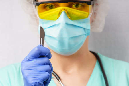 A woman in a medical mask holds a surgical scalpel in her hand on a white background