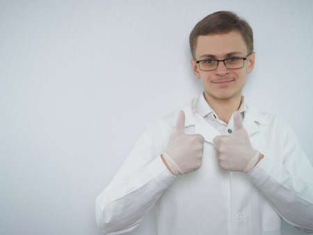 Portrait of a young man of European appearance in a white medical coat. A young doctor in a white coat. Medical student. . High quality photo