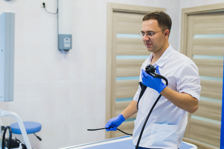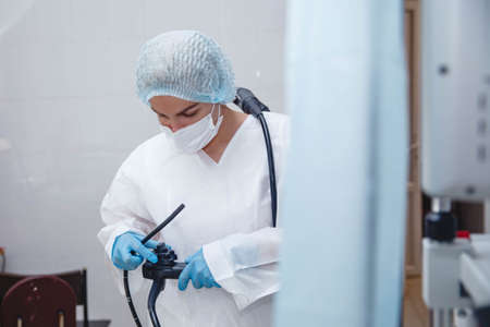 A young female endoscopist in a white protective suit, cap and gloves prepares the equipment for work.