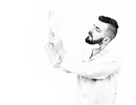 man doctor wears medical gloves, close up