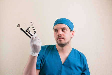 Young smiling doctor with medical instruments in his hand in blue surgeon suit isolated