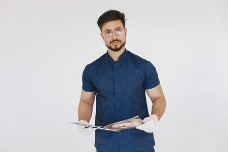 A portrait of a medical doctor posing against white background