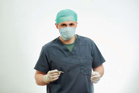 A surgeon in scrubs is posing with a scalpel in an operating room. White background behind a doctor who wears a surgical shirt, disposable medical gloves, a medical face mask, and a scrub cap.