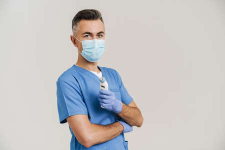Medical doctor in face mask and gloves posing with infrared thermometer isolated over white wall