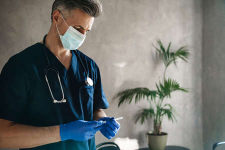 Mid aged male doctor wearing protective mask holding a syringe with vaccine