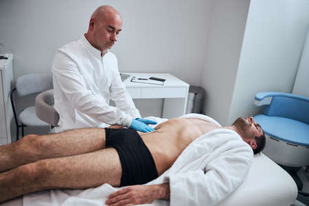 Doctor is working in modern clinic and manually checking stomach of man lying on couch