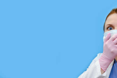 Portrait of a doctor woman with a fright in the eyes, copy space. Nurse in a white uniform and a protective mask on a blue background.