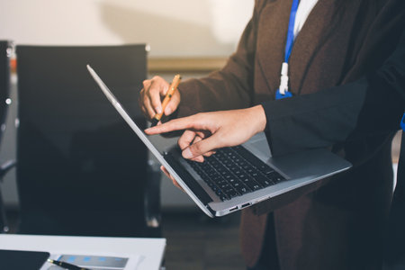 Close-up, During a meeting with board members, a businesswoman uses a notebook laptop computer and types on her keyboard. blurred background