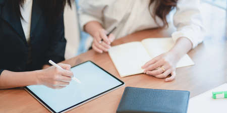 Cropped shot of passionate businesswomen working on the project together while using tablet