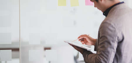 Cropped shot of young businessman working on his project while using digital tablet in modern office room