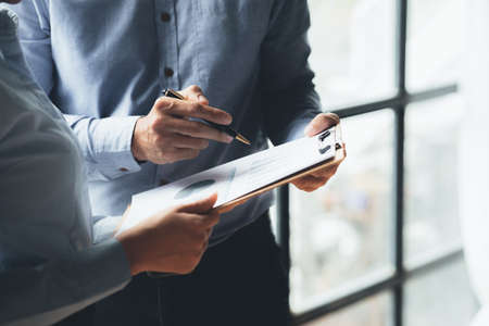 Atmosphere of a startup company meeting, business people are meeting together to summarize and plan investment finances, they are the founders of the company. Business administration concept.
