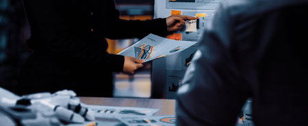 Businesspeople analyzing paper reports with diagrams. Business team standing at table, looking and pointing at documents. Closeup shot of table and hands. Analysis and teamwork concept