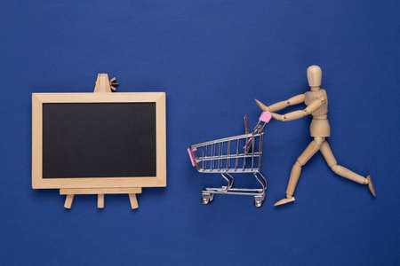 Wooden puppet with shopping trolley and Mini Empty chalk board with copy space on blue background. shopping, sale concept