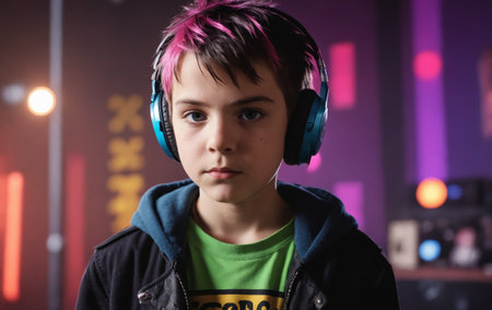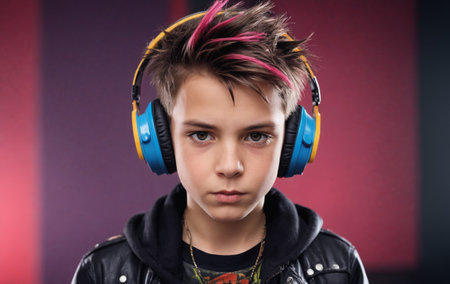 A cool young boy with black hair wearing headphones is looking at the camera, enjoying the entertainment of music artist through his audio equipment