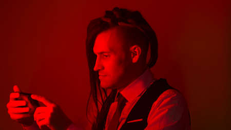 Young happy male browsing mobile phone in dark room. Business man using smartphone, standing in darkness with illumination of red light