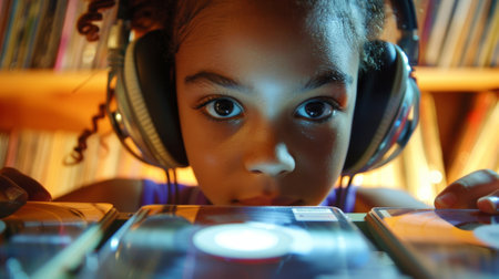A teenage girl wears oversized headphones as she thumbs through the records her eyes lighting up at each new discovery