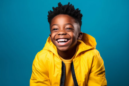 Generative AI : Delighted African American boy schoolkid student laughs and shows strong muscles while having fun during school against yellow background