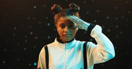 Girl, portrait and astronaut with salute in spacesuit at night for galaxy adventure, journey or travel. Female person, young teenager or child with recognition for respect on a dark studio background