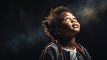 african american little girl looking up on black background with smoke