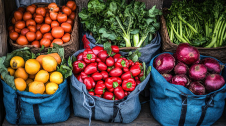 A vibrant display of fresh organic vegetables and fruits in baskets at a market stall. The colorful arrangement showcases a variety of produce, including tomatoes, peppers, and greens, emphasizing healthy eating and local agriculture.
