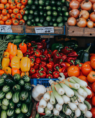 A vibrant display of colorful vegetables neatly arranged in rows at a market, showcasing fresh produce ready for sale. The image highlights healthy eating and farm-fresh foods.