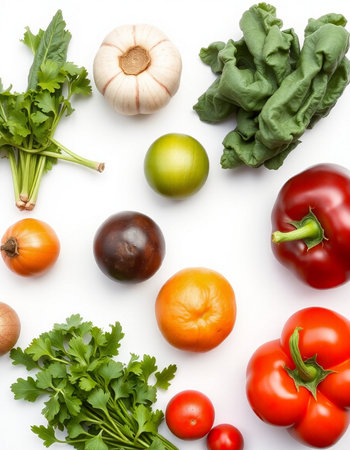 Fresh fruits and vegetables arranged on a clean white background, showcasing healthy food choices and vibrant colors.