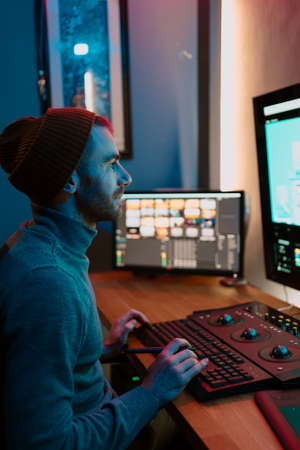 caucasian man making electronic music with a midi controller in his home studio, music industry and production concept