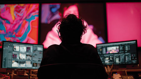 A silhouette of a person sits before multiple computer screens and larger display panels. The scene uses backlighting, creating a dark outline with light reflecting the person. Images on the screens are visible. This image may be suitable for commercial applications related to technology, design, or video production.